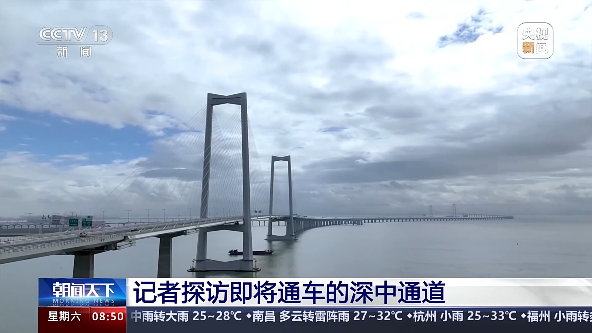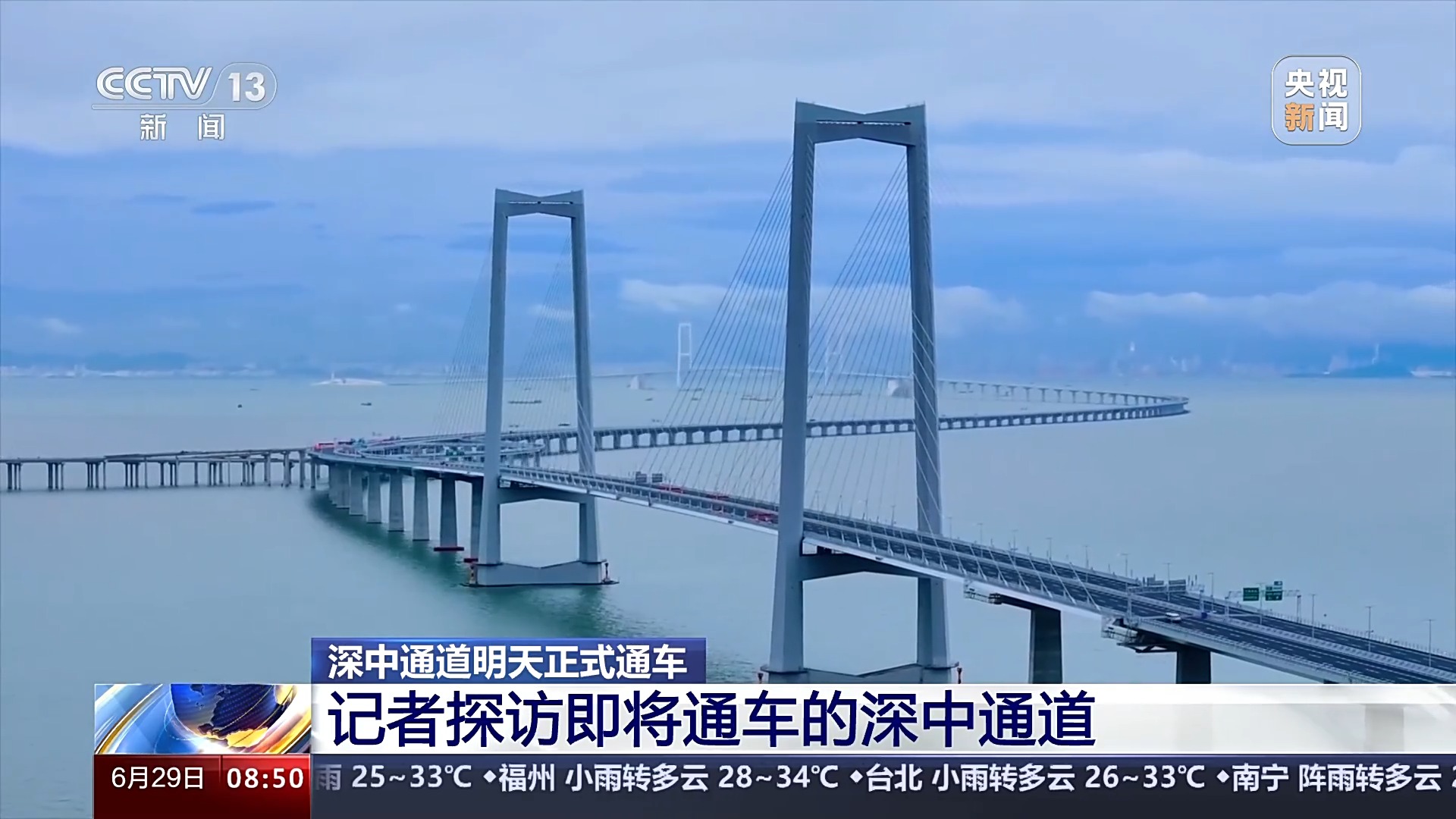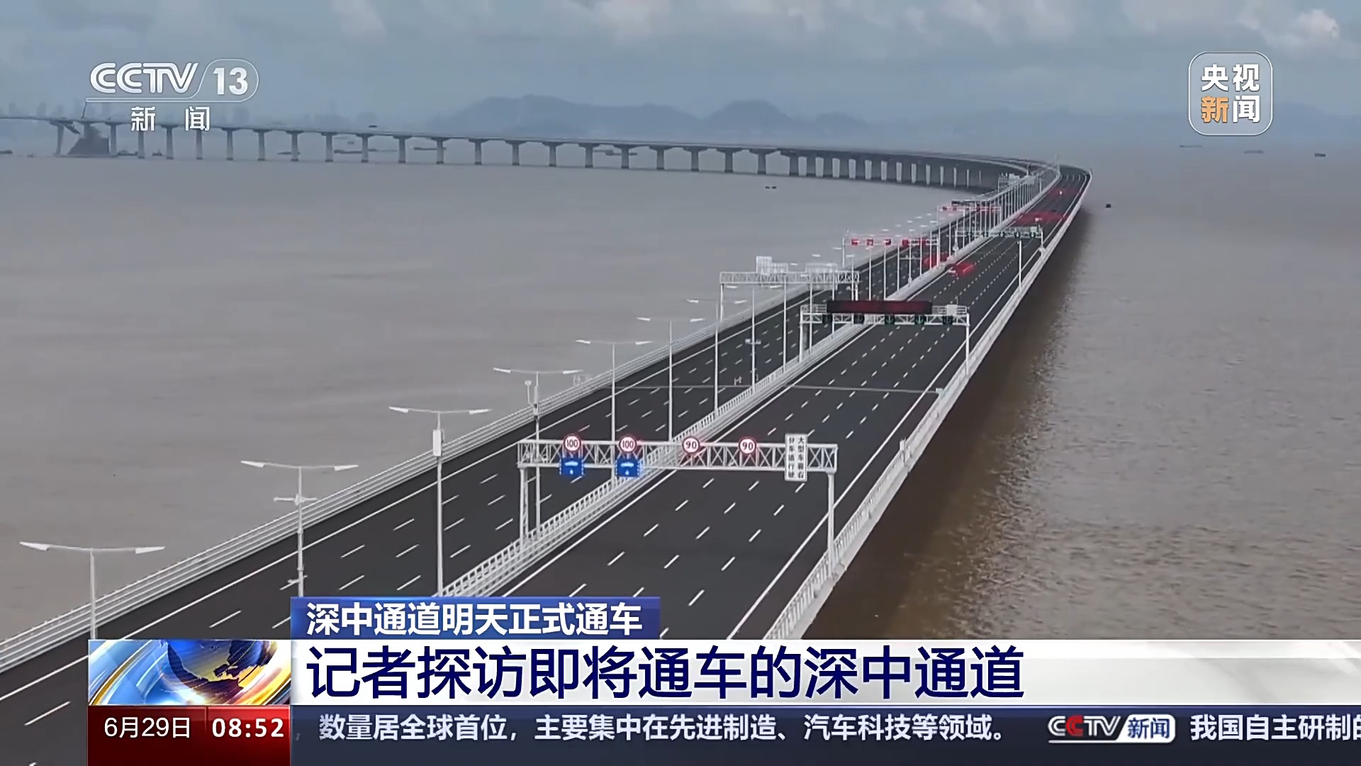 總臺記者 王思元:現(xiàn)在我們就已經(jīng)行駛到了深中通道的一個制高點的位置,這個位置離伶仃洋的海面有91米高。也就是相當(dāng)于30層樓的這個高度,大家可以看一下海面。