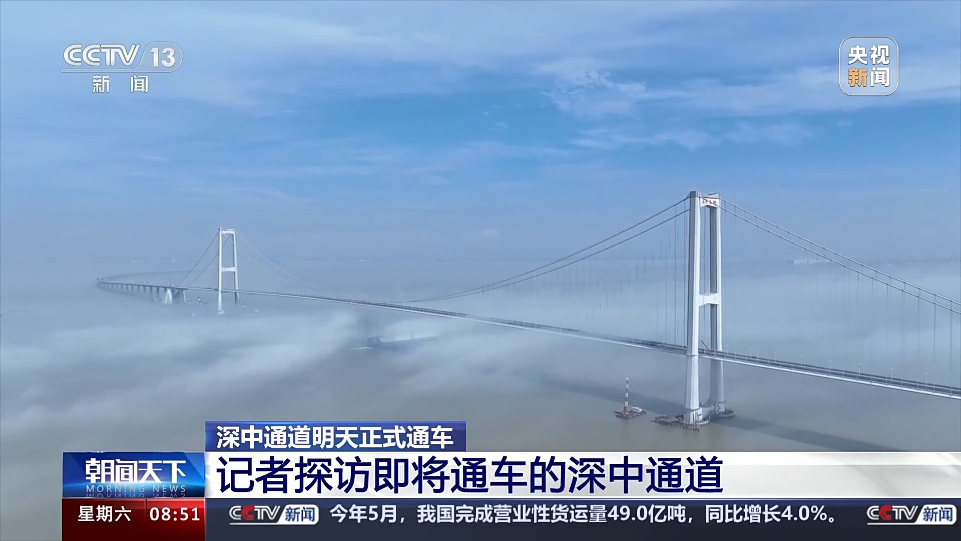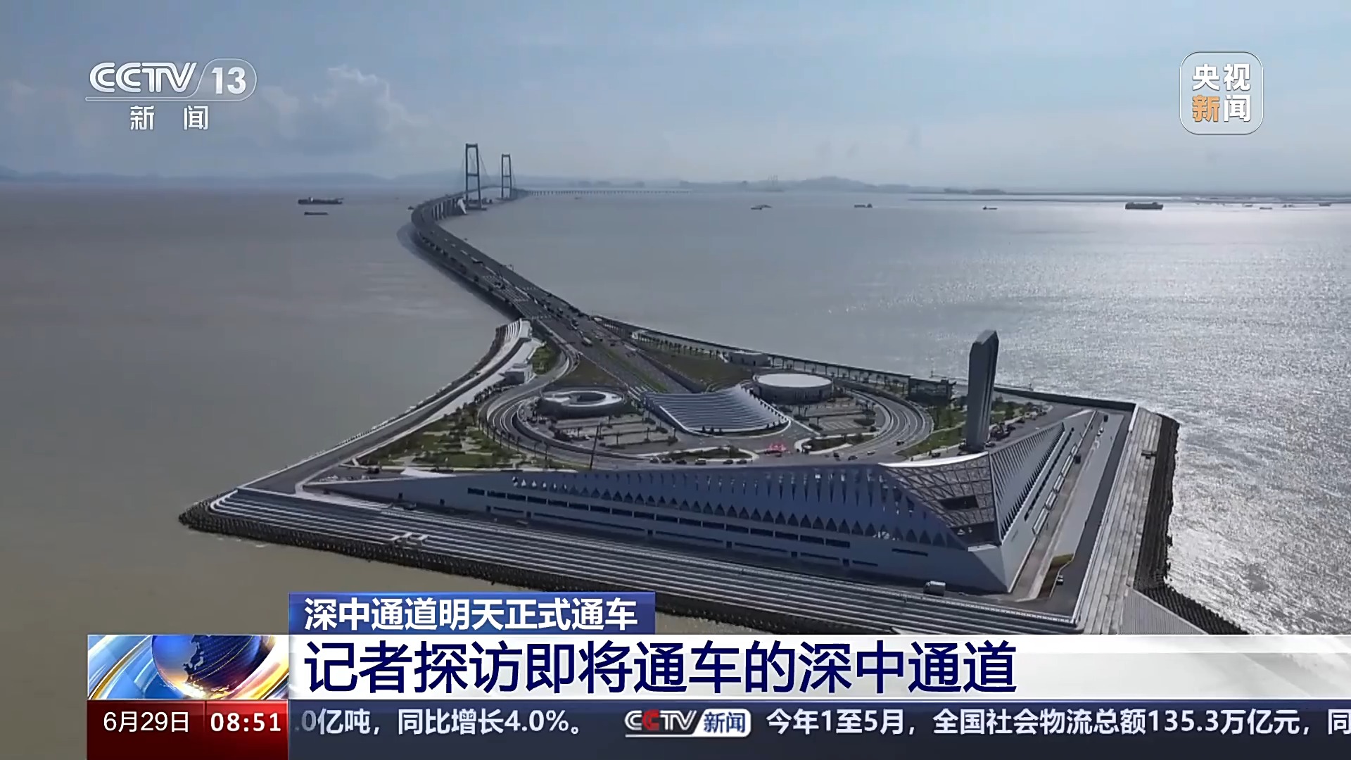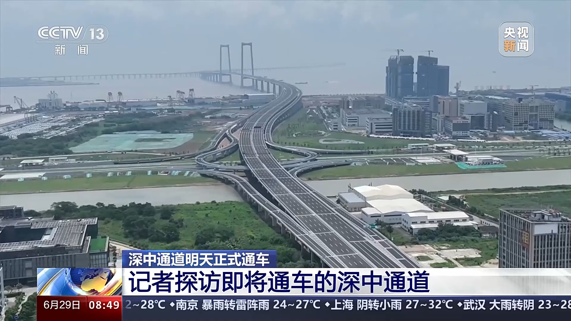 總臺記者 王思元:現(xiàn)在我們就已經(jīng)行駛到了深中通道的一個制高點的位置,這個位置離伶仃洋的海面有91米高。也就是相當(dāng)于30層樓的這個高度,大家可以看一下海面。
