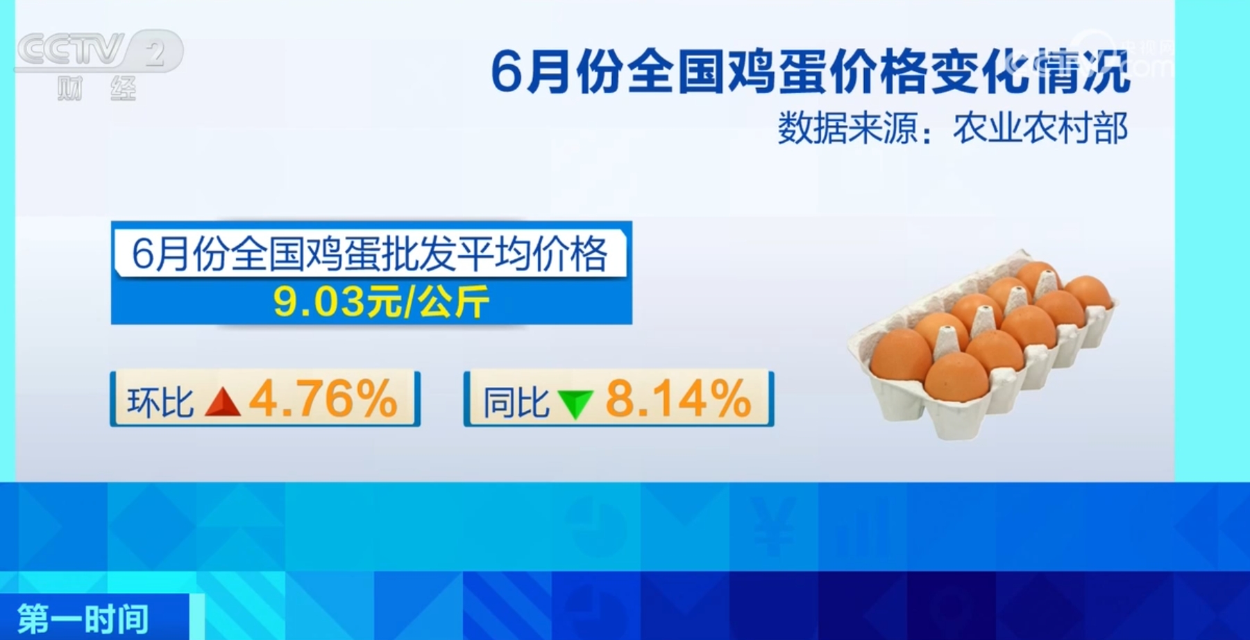 據(jù)農(nóng)業(yè)農(nóng)村部監(jiān)測(cè),6月份全國(guó)雞蛋批發(fā)平均價(jià)格為每公斤9.03元,環(huán)比上漲4.76%,同比下降8.14%。