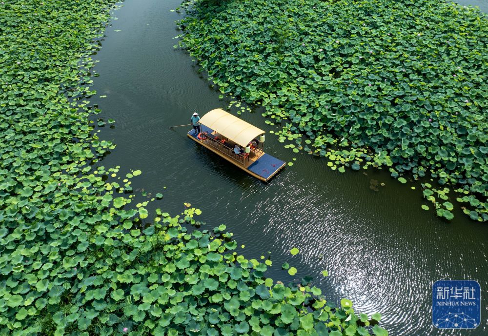 7月3日,游客在江蘇省興化市千垛鎮(zhèn)的萬畝荷塘景區(qū)賞荷游玩(無人機照片)。新華社發(fā)(周社根 攝)