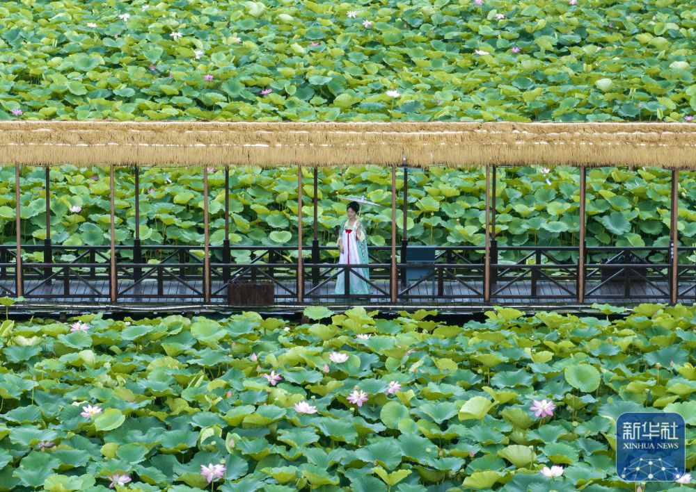 7月8日,游客在江蘇省興化市千垛鎮(zhèn)的萬畝荷塘景區(qū)賞荷游玩(無人機照片)。新華社發(fā)(周社根 攝)