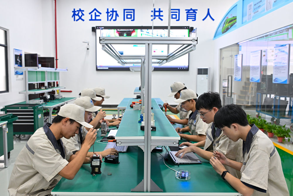 7月26日,湖南鐵道職業(yè)技術(shù)學(xué)院的學(xué)生在車載電源系統(tǒng)運維實訓(xùn)室進行核心零部件的拆裝與檢測訓(xùn)練。該實訓(xùn)室可開展軌道車輛逆變裝置運行、維護、試驗、檢修等實習(xí)實訓(xùn),電源變換技術(shù)、電力電子技術(shù)等課程實習(xí)實訓(xùn)。新華社記者 李鑫 攝