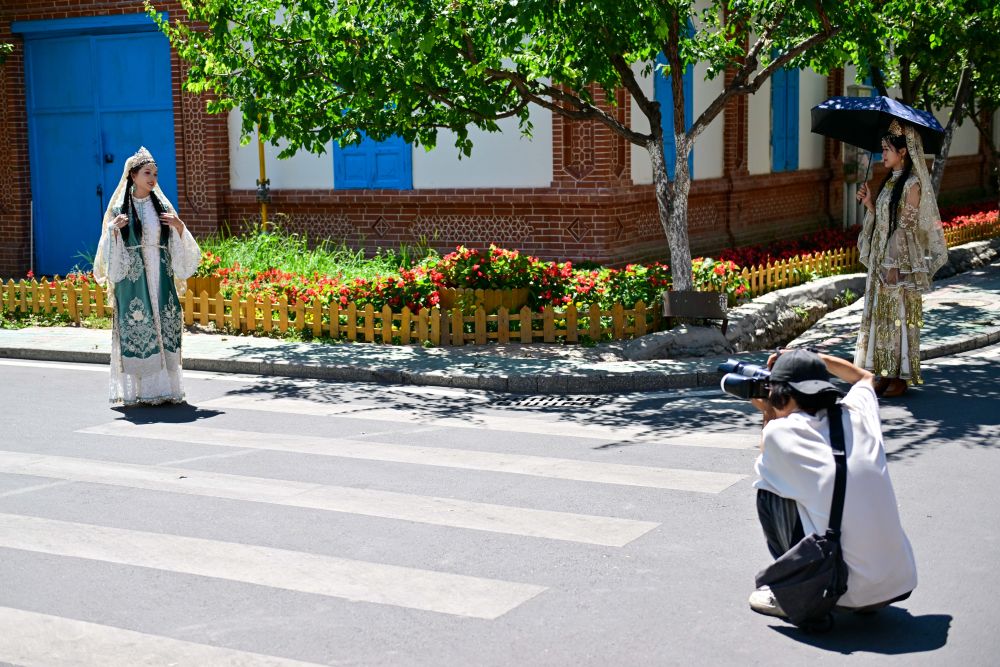 在伊犁哈薩克自治州伊寧市六星街,游客體驗旅拍項目(7月27日攝)。
