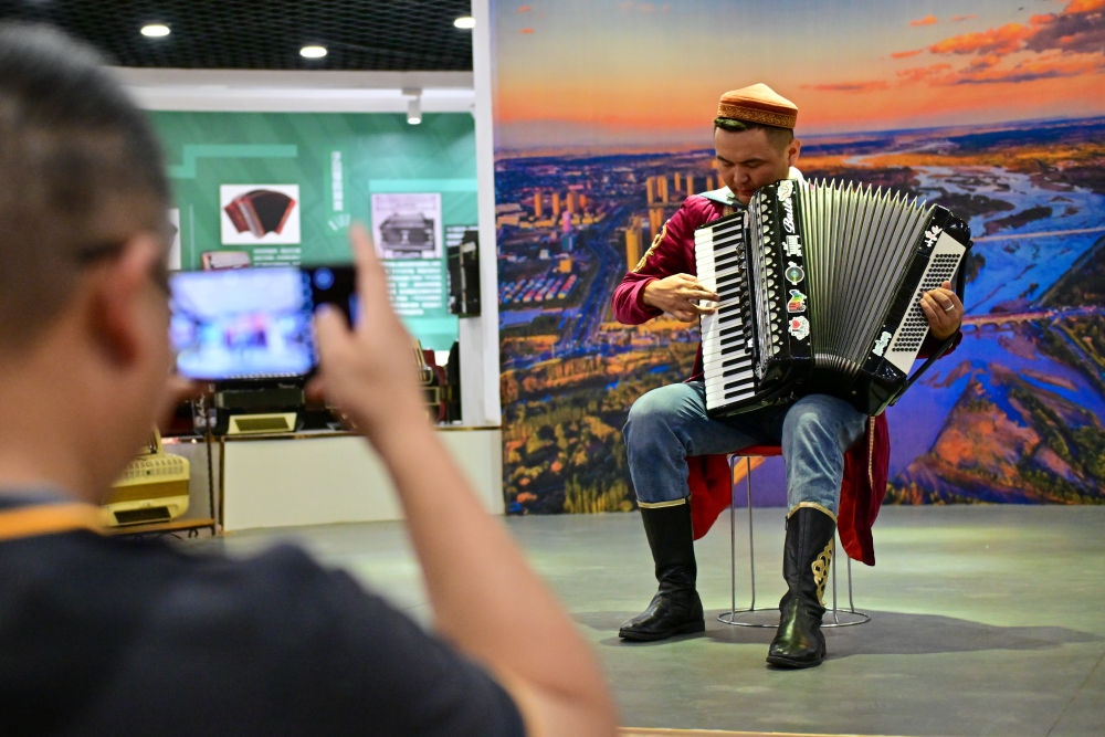 在伊犁哈薩克自治州伊寧市六星街,游客在亞歷山大手風琴珍藏館欣賞手風琴表演(7月27日攝)。