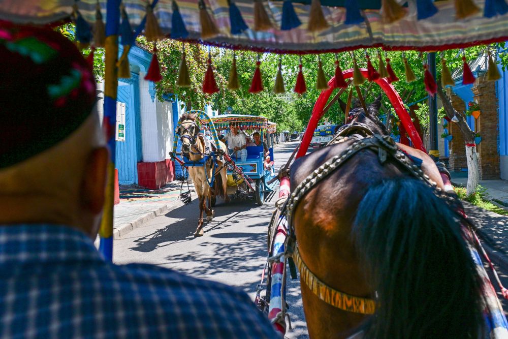 在伊犁哈薩克自治州伊寧市喀贊其民俗旅游區(qū),游客乘坐馬車觀光游覽(7月27日攝)。