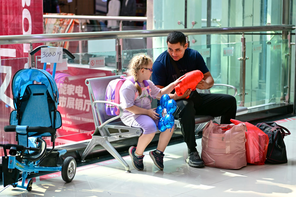 在中哈霍爾果斯國際邊境合作中心,來自哈薩克斯坦的游客在購物后休息(7月27日攝)。