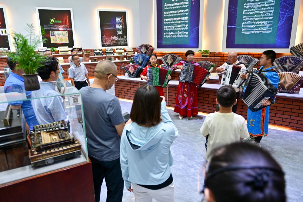 游客在新疆塔城市手風琴文化展示廳欣賞手風琴表演(7月24日攝)。