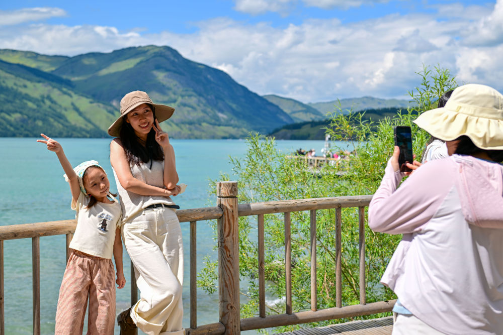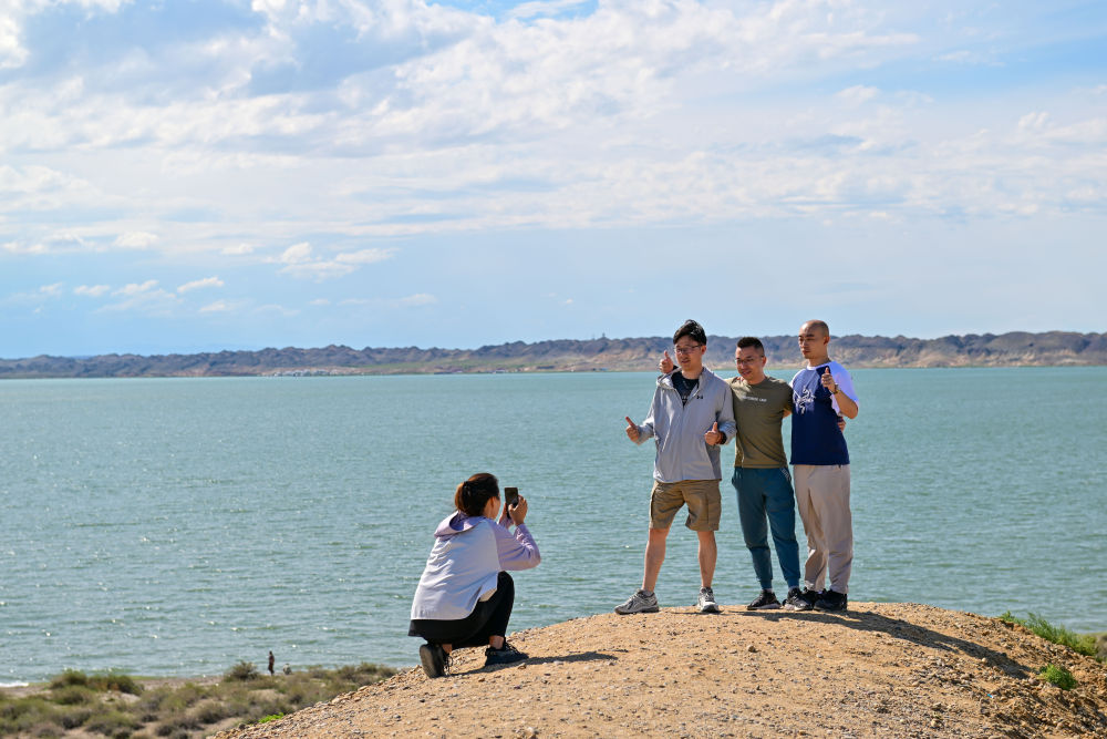 游客在新疆阿勒泰地區(qū)福海縣烏倫古湖合影留念(7月21日攝)。