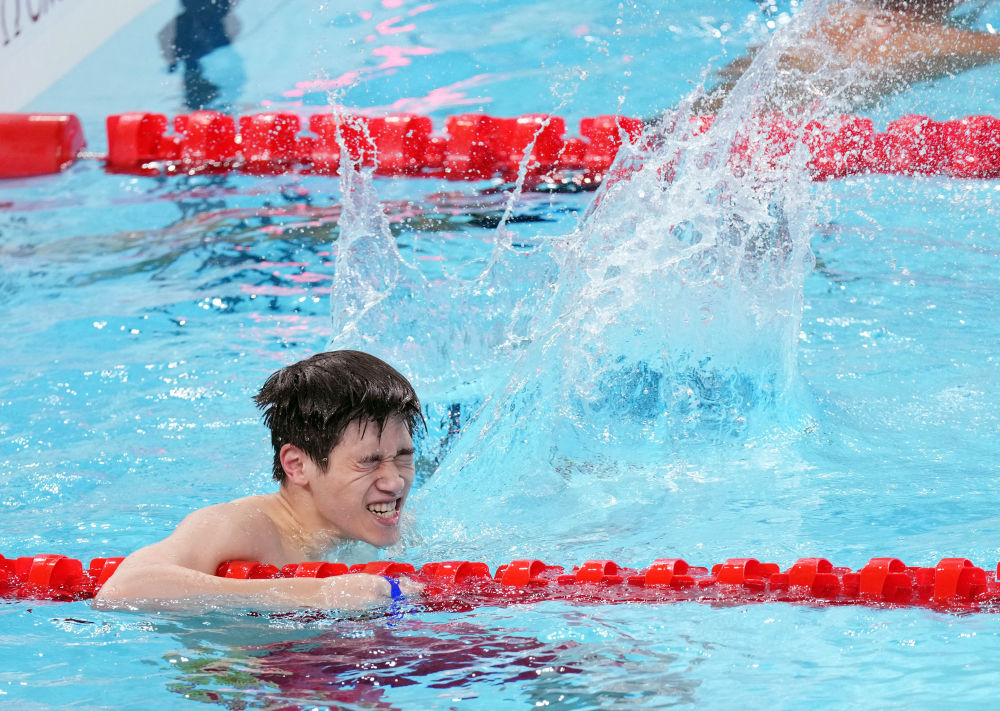 ↑中國選手潘展樂(右)與亞軍澳大利亞選手查默斯在比賽后慶祝。