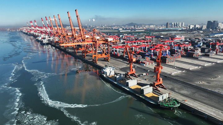 貨船在遼寧營口港碼頭裝運糧食(2024年1月10日攝,無人機照片)。