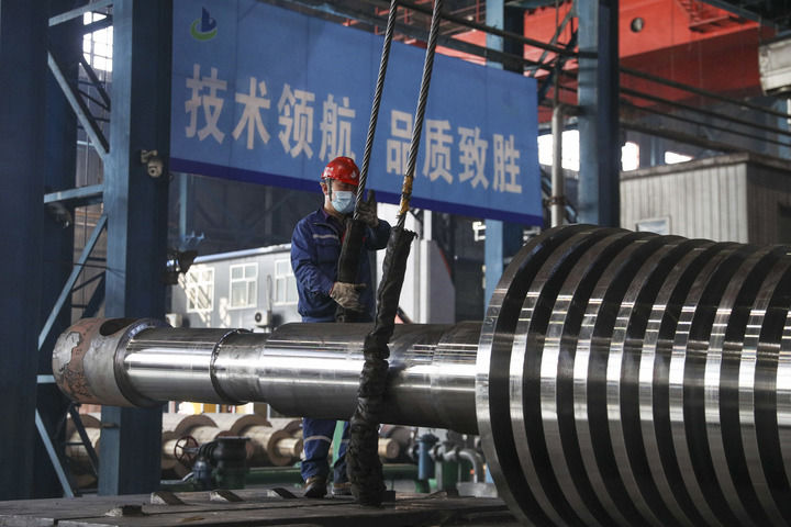 工人在位于黑龍江省齊齊哈爾市的中國一重集團有限公司生產(chǎn)車間運送產(chǎn)品(2024年3月5日攝)。
