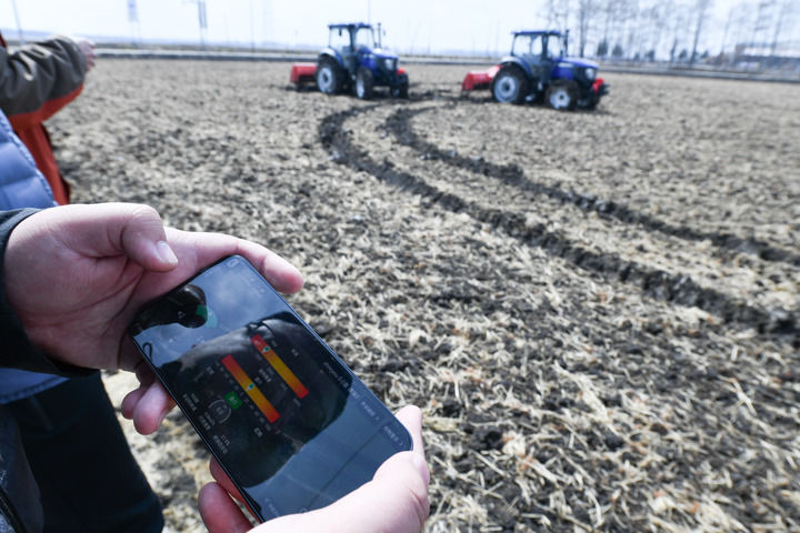 在黑龍江北大荒農(nóng)業(yè)股份有限公司友誼分公司智慧農(nóng)場的地塊內(nèi),技術(shù)人員操作兩輛拖拉機進行無人駕駛測試(2024年4月3日攝)。