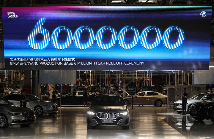 在寶馬沈陽生產(chǎn)基地拍攝的華晨寶馬第600萬輛整車下線儀式(2024年5月8日攝)。