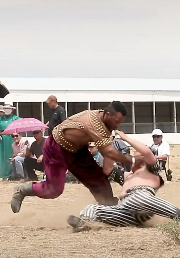 阿斯琴:包括腰力、轉動能力和手臂的力量。(牧民的傳統(tǒng))馴馬、馴牛、馴駱駝,不能用蠻力,要有巧勁,要有這方面的天賦才行。比賽規(guī)則就是單排淘汰,倒了就不能再上了。一跤定勝負,這是它摔跤的特點。