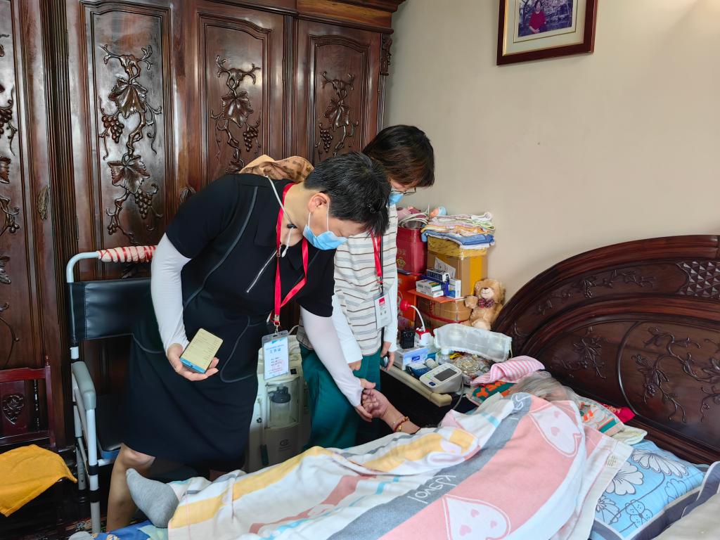 76歲的劉爺爺腦溢血后部分肢體偏癱,同時(shí)患有一些基礎(chǔ)性老年病?!耙葴y(cè)量老人生命體征是否平穩(wěn),再進(jìn)行助浴,其間也要隨時(shí)關(guān)注老人的狀態(tài)?!彼f(shuō)。
