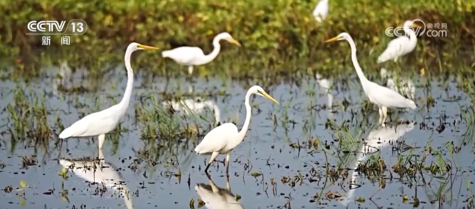 在河南周口市淮陽(yáng)區(qū),由于近期降雨頻繁,當(dāng)?shù)毓胚\(yùn)河不少低洼地帶變成灘涂濕地,多群白鷺匯聚于此,棲息覓食。