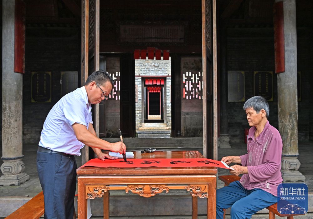 8月15日,一名楹聯(lián)愛好者在大蘆村古宅里寫對(duì)聯(lián)。