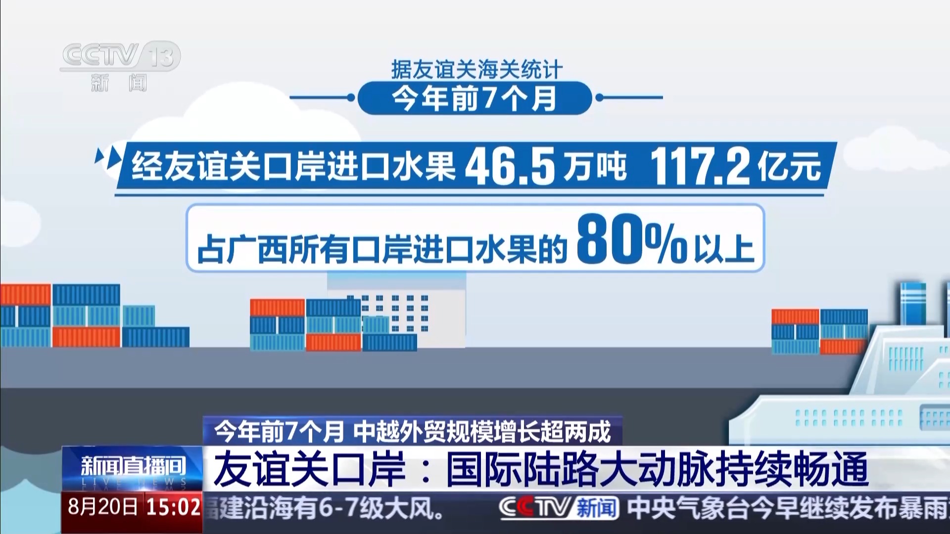 據(jù)友誼關(guān)海關(guān)統(tǒng)計(jì),今年前7個(gè)月,經(jīng)友誼關(guān)口岸進(jìn)口水果46.5萬(wàn)噸、117.2億元,占廣西所有口岸進(jìn)口水果的80%以上。