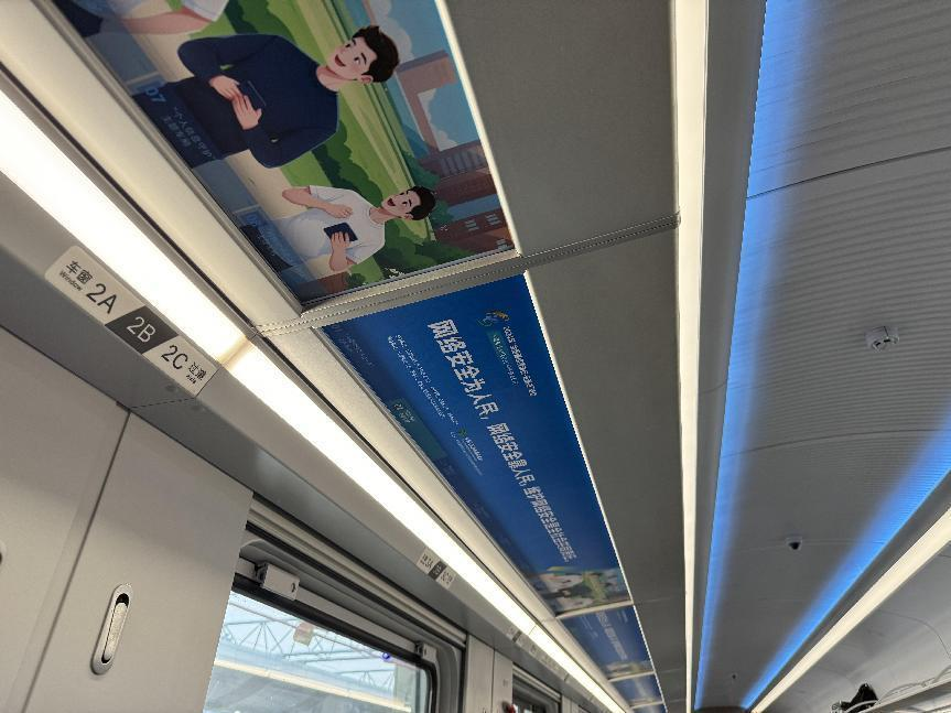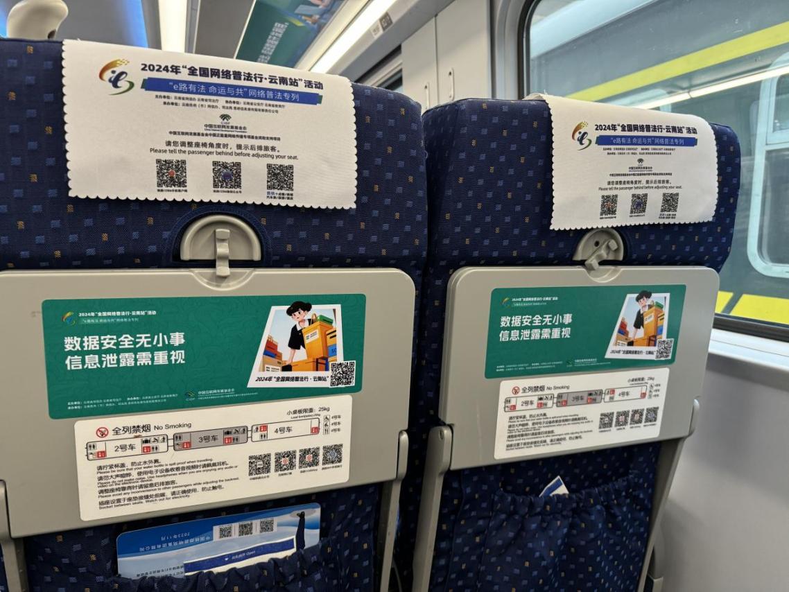 據(jù)介紹,專列的8個主題車廂分別以“中國網(wǎng)絡法治三十年”“網(wǎng)絡安全”“數(shù)據(jù)安全”“未成年人網(wǎng)絡保護”“數(shù)據(jù)出境之旅”“反網(wǎng)暴凈網(wǎng)行動”“個人信息守護”以及“網(wǎng)絡空間命運共同體”命名,通過鏡框海報、玻璃貼、小桌板貼、行李架彩貼、頭枕片、車內(nèi)LED信息屏等形式多樣的載體,全面展示網(wǎng)絡法治30年成就、網(wǎng)絡空間命運共同體主張。讓乘客們在享受舒適旅途的同時,也能輕松學習到實用的法律信息。