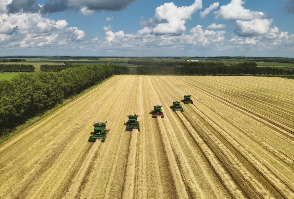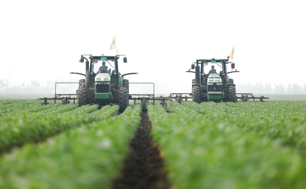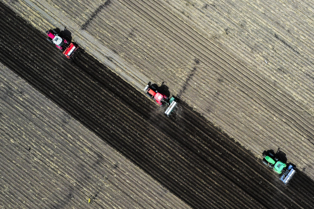 2024年6月25日,大型農(nóng)機(jī)在黑龍江北大荒集團(tuán)鶴山農(nóng)場(chǎng)作業(yè),為土壤增溫放寒(無人機(jī)照片)。今年,黑龍江推進(jìn)高標(biāo)準(zhǔn)農(nóng)田建設(shè)、侵蝕溝治理和農(nóng)田防護(hù)林更新修復(fù)一體化實(shí)施,建設(shè)高標(biāo)準(zhǔn)農(nóng)田1400萬畝、治理侵蝕溝1.2萬條,全面加強(qiáng)黑土地保護(hù)利用。