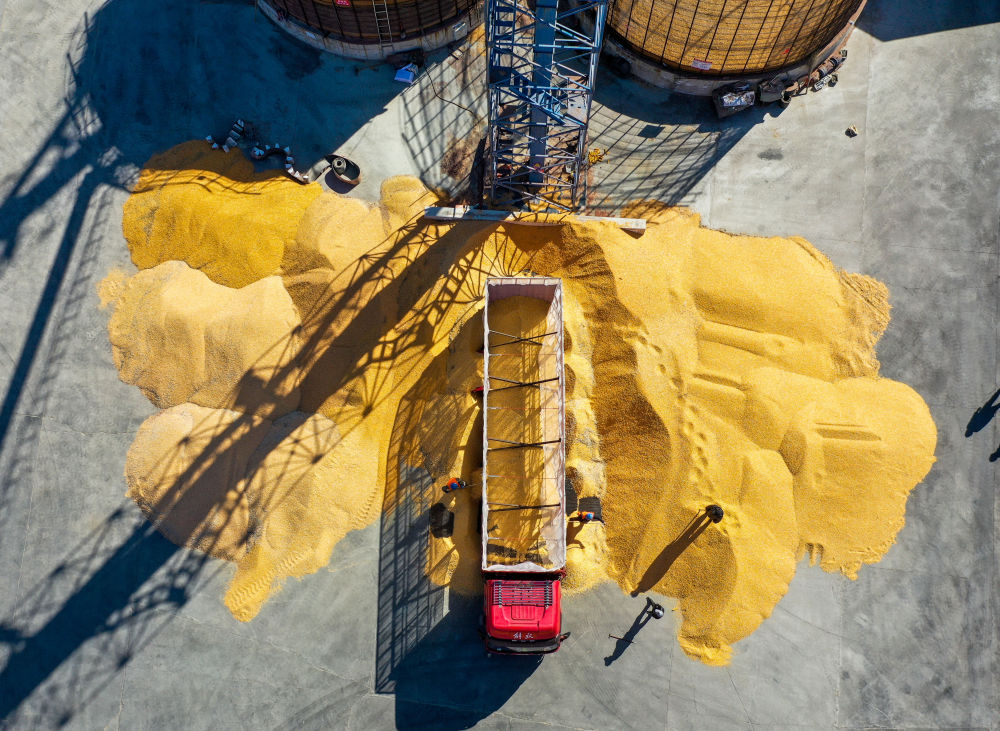 2023年10月15日,司機(jī)駕駛運(yùn)糧車在內(nèi)蒙古通遼市科爾沁左翼中旗腰林毛都鎮(zhèn)收糧站卸糧(無人機(jī)照片)。