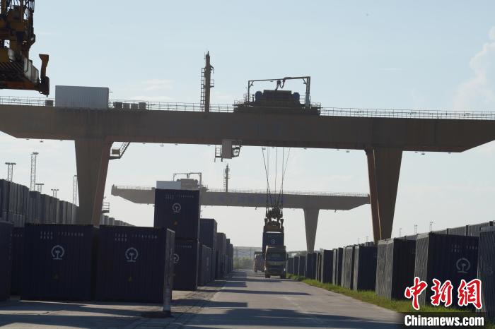 圖為龍門(mén)吊正將集裝箱從卡車(chē)轉(zhuǎn)移至中越貨運(yùn)班列。 王以照 攝