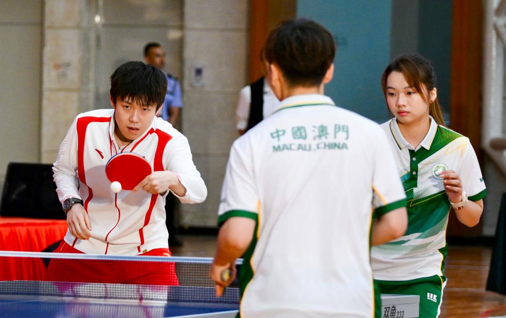9月1日,乒乓球運(yùn)動(dòng)員王楚欽(左)與澳門運(yùn)動(dòng)員切磋球技。新華社記者 郭雨祺 攝