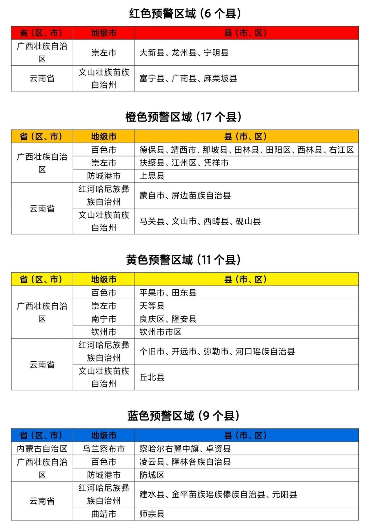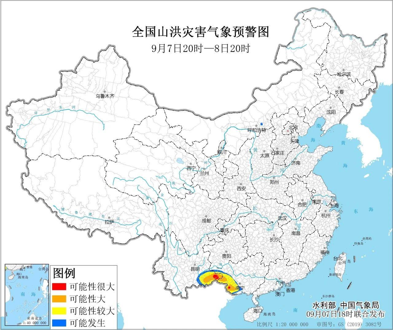 預計,9月7日20時至9月8日20時,廣西西部和西南部、云南東部等地部分地區(qū)發(fā)生山洪災害可能性大(橙色預警),其中,廣西西南部、云南東部局地發(fā)生山洪災害可能性很大(紅色預警)。其他地區(qū)也可能因局地短歷時強降水引發(fā)山洪災害,請各地注意做好實時監(jiān)測、防汛預警和轉移避險等防范工作。