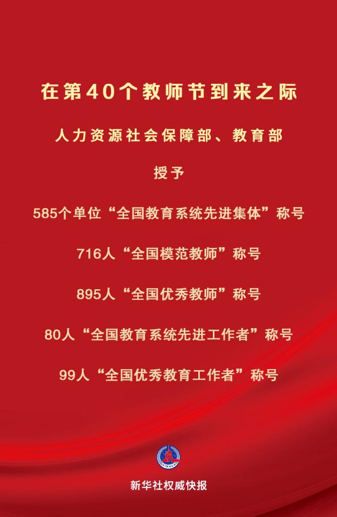 在中華人民共和國成立75周年和第40個(gè)教師節(jié)到來之際,為大力弘揚(yáng)教育家精神,營(yíng)造全社會(huì)尊師重教濃厚氛圍,激勵(lì)全國廣大教師和教育工作者落實(shí)立德樹人根本任務(wù),積極投身教育強(qiáng)國建設(shè),人力資源社會(huì)保障部、教育部決定授予中央財(cái)經(jīng)大學(xué)金融學(xué)院等585個(gè)單位“全國教育系統(tǒng)先進(jìn)集體”稱號(hào);授予刁榮春等716名同志“全國模范教師”稱號(hào);授予于淵等895名同志“全國優(yōu)秀教師”稱號(hào);授予王彥平等80名同志“全國教育系統(tǒng)先進(jìn)工作者”稱號(hào);授予王軍等99名同志“全國優(yōu)秀教育工作者”稱號(hào)。