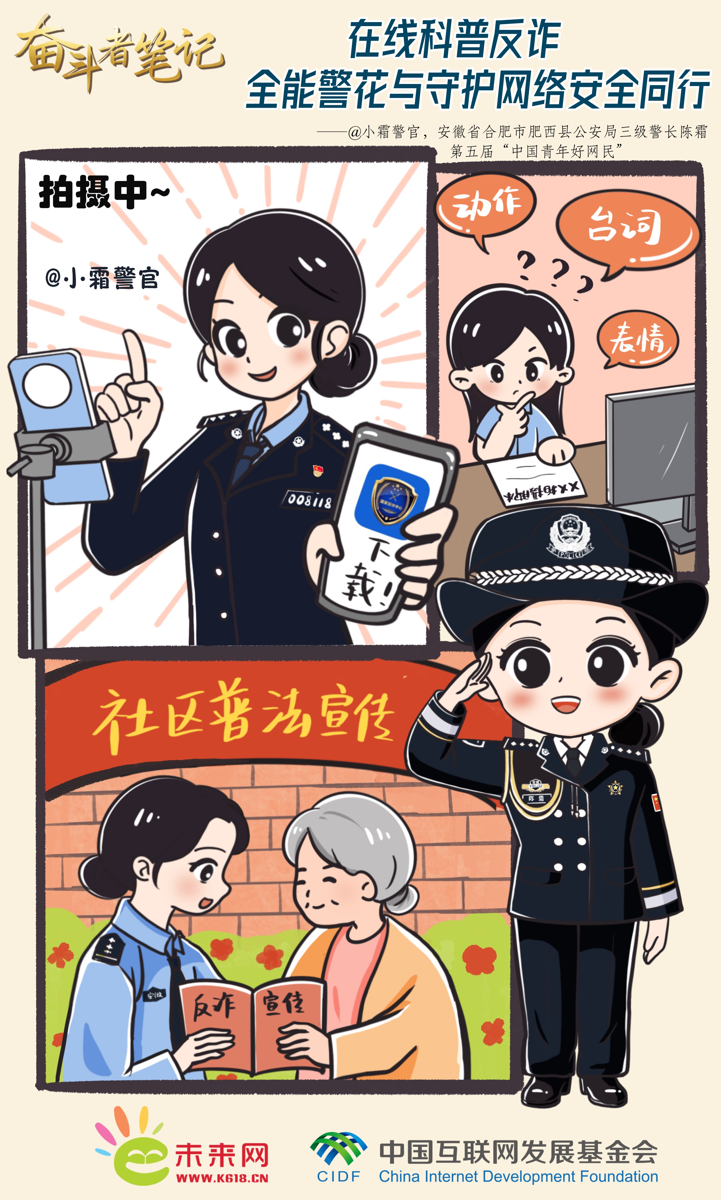 “一網(wǎng)情深”筑防線,心系百姓護(hù)安寧。面對(duì)在辦案過(guò)程中遇到的百姓養(yǎng)老錢、救命錢被騙的情況,陳霜愈發(fā)感到防范電詐和打擊電詐同樣重要。她創(chuàng)建“小霜警官”警務(wù)自媒體賬號(hào),認(rèn)真研究分析電信網(wǎng)絡(luò)詐騙的規(guī)律特點(diǎn)、思考防詐辦法,用大家喜聞樂(lè)見(jiàn)的形式為百姓普法、宣傳反詐知識(shí)。她還積極探索宣傳新路徑,緊跟時(shí)事熱點(diǎn),將防詐知識(shí)寫(xiě)成幽默風(fēng)趣的段子、引人入勝的故事和生動(dòng)的短劇。自2016年以來(lái),“小霜警官”累計(jì)推出了反詐、普法、便民等內(nèi)容原創(chuàng)短視頻500余個(gè),總粉絲量過(guò)800萬(wàn),全平臺(tái)播放量超50億。正如她的個(gè)性簽名所寫(xiě)——“一個(gè)特別接地氣的警察朋友”,親民的形象和接地氣的宣傳方式,讓她受到了廣大網(wǎng)友的關(guān)注和喜愛(ài)。
