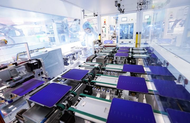 安徽合肥,全球單體產(chǎn)能最大的異質(zhì)結(jié)光伏電池及組件一體化工廠,工業(yè)機(jī)器人將一個個硅片投送到一架白色機(jī)器的腔體,經(jīng)過綿延的智能化流水線,狀如手機(jī)大小、薄如紙片的光伏電池片便下線了。