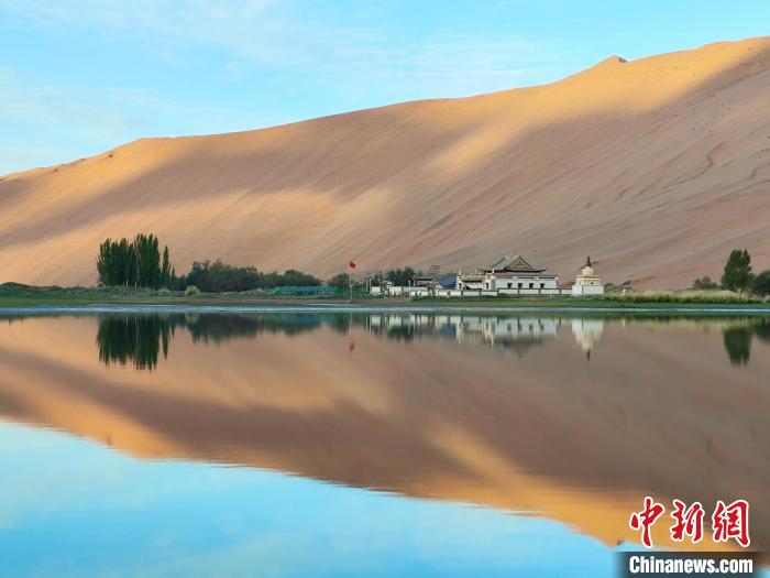 9月21日,擁有“沙漠故宮”之稱(chēng)的巴丹吉林廟在湖光山色之中映出倒影。中新社記者 陳溯 攝