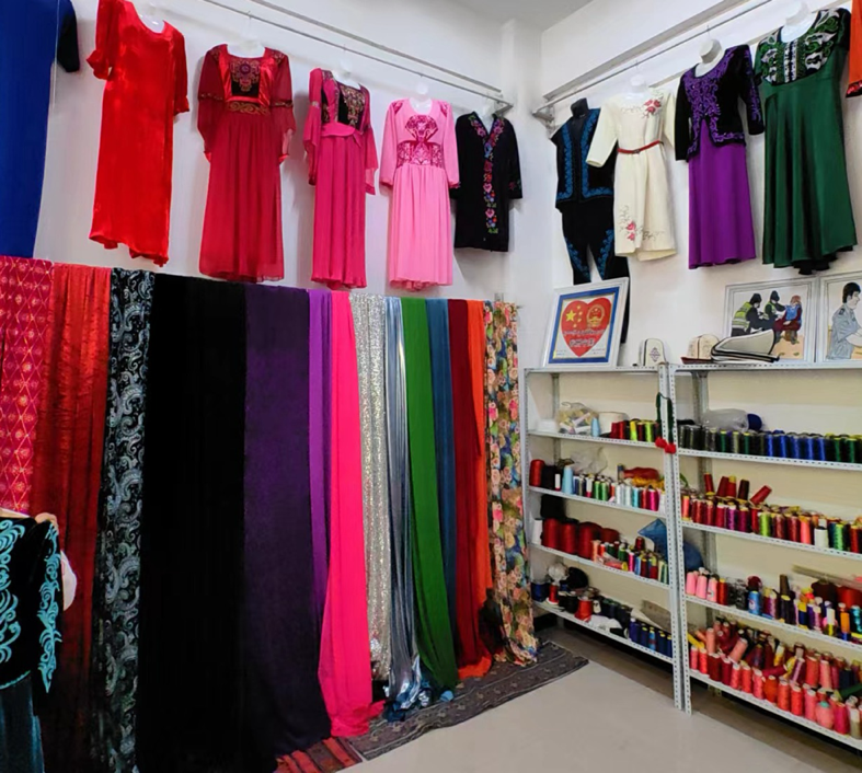 托云牧場積極鞏固政策支持,集中力量打造項(xiàng)目驅(qū)動(dòng),有效推進(jìn)地方產(chǎn)業(yè)集群的全面發(fā)展,實(shí)現(xiàn)經(jīng)營集約化與產(chǎn)業(yè)高效整合。2015年,由牧場“刺繡巧匠”吐孔·沙熱牽頭并成功注冊(cè)了“托云牧場帕米爾刺繡”合作社。到了2019年,牧場成功申請(qǐng)到160萬元援疆資金,用于建設(shè)新的手工刺繡產(chǎn)品生產(chǎn)基地。在吐孔·沙熱的帶動(dòng)下,合作社目前擁有60名成員,其中43名技藝嫻熟的繡工,年總收入攀升至三十萬。該合作社通過直銷、與克州百來思服裝店的業(yè)務(wù)合作,以及接受附近學(xué)校的校服訂單等多種渠道,將其生產(chǎn)的床品、家居布藝、女性服裝及校服推向阿圖什市、烏恰縣等地區(qū)市場。