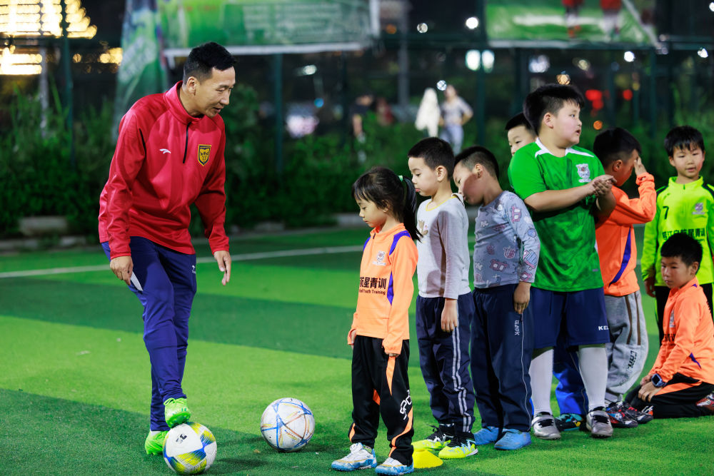 4月8日,董永恒(左一)在對(duì)榕江縣的小球員進(jìn)行培訓(xùn)。新華社記者 劉續(xù) 攝