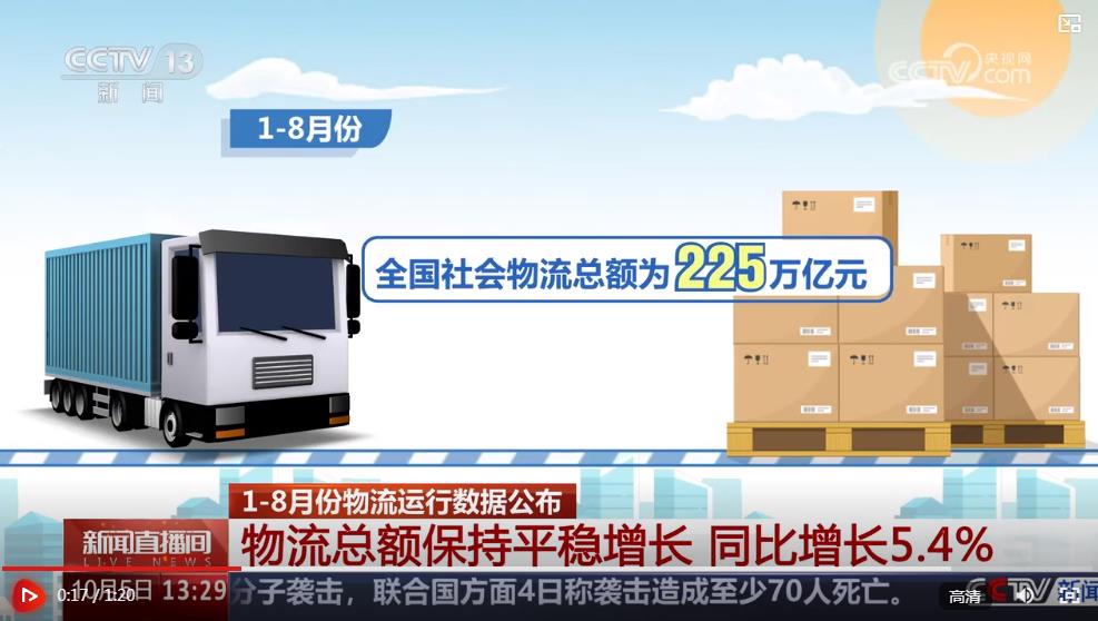 央視網(wǎng)消息:中國物流與采購聯(lián)合會10月5日公布今年1至8月份物流運行數(shù)據(jù)。數(shù)據(jù)顯示,8月份社會物流運行總體穩(wěn)定,社會物流總額累計保持5%以上的穩(wěn)定增長。