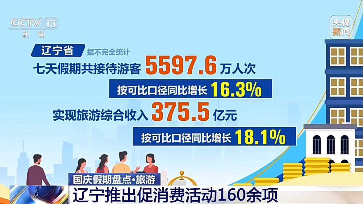 遼寧省據(jù)不完全統(tǒng)計,七天假期共接待游客5597.6萬人次,按可比口徑同比增長16.3%,實現(xiàn)旅游綜合收入375.5億元,按可比口徑同比增長18.1%。假期里遼寧省推出促消費活動160余項,全省各地舉辦文化藝術(shù)、群眾文化、非遺、文博等各類活動600余場,通過線上線下聯(lián)動的方式,豐富人們假日文化生活。