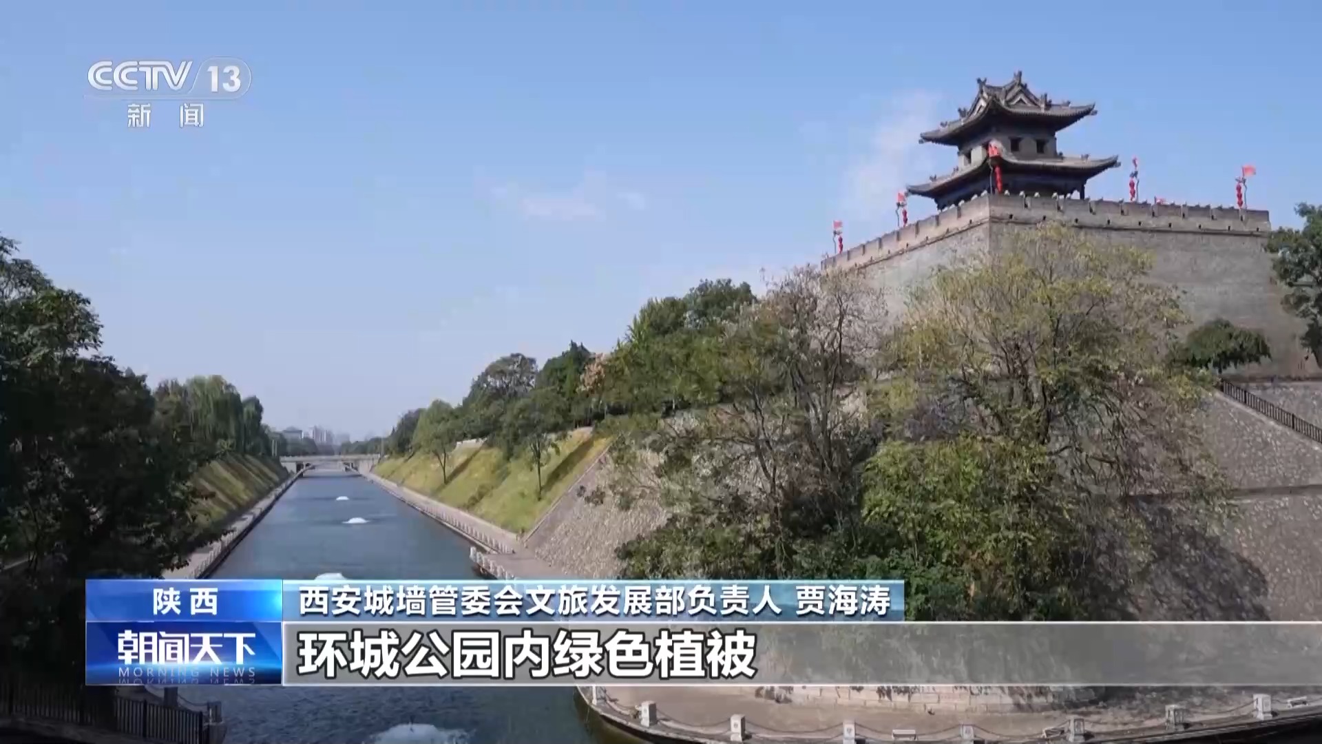 西安城墻管委會(huì)文旅發(fā)展部負(fù)責(zé)人 賈海濤:對(duì)護(hù)城河水體進(jìn)行全面修復(fù)治理,改善和優(yōu)化水體健康,環(huán)城公園內(nèi)綠色植被達(dá)到了104.5萬(wàn)平方米,栽植水生植物2000余平方米。