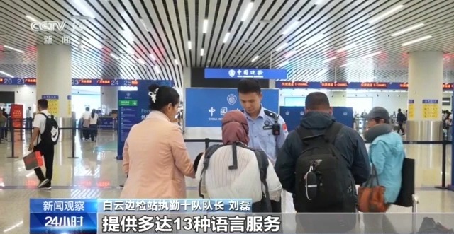 白云邊檢站執(zhí)勤十隊隊長 劉磊:現(xiàn)場這邊的8條通道設(shè)置為廣交會專用通道,包括從廊橋到通道前,全程都設(shè)置了指引標(biāo)志和引導(dǎo)民警,提供多達(dá)13種語言服務(wù)。