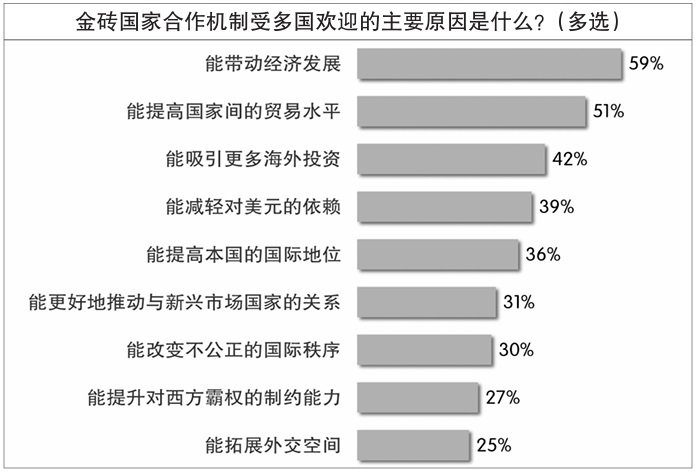 在12國受訪者看來,金磚機制受多國歡迎的最主要原因是它“能帶動經濟發(fā)展”,有近六成受訪者認同此原因。過半受訪者認為,“能提高國家間的貿易水平”是金磚機制受歡迎的原因。此外,能“吸引更多海外投資”“減輕對美元的依賴”“提高本國國際地位”等原因也獲得較多認同。王友明對《環(huán)球時報》記者分析說:“開放、包容、合作、共贏的精神是金磚國家能夠走向‘大金磚’的根本原因,這四個要素缺一不可?!?/p>
