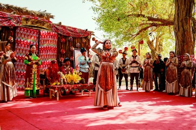 村子里,許多高齡老人依舊耳聰目明,豁達豪放,和著古老的旋律翩然而舞?!拔覐乃锬竞幼邅?,牛羊遍地,魚兒歡暢,姑娘,我多想到你的身旁……”古老的羅布淖爾民歌傳唱至今。今天的羅布人村寨,據(jù)傳是從羅布泊遷徙而來。村寨內(nèi)的特色婚房前,來自五湖四海的游客身著民族服飾,在迎親、跨火盆等熱鬧喜慶的儀式中,沉浸式感受當(dāng)?shù)氐膫鹘y(tǒng)婚俗。