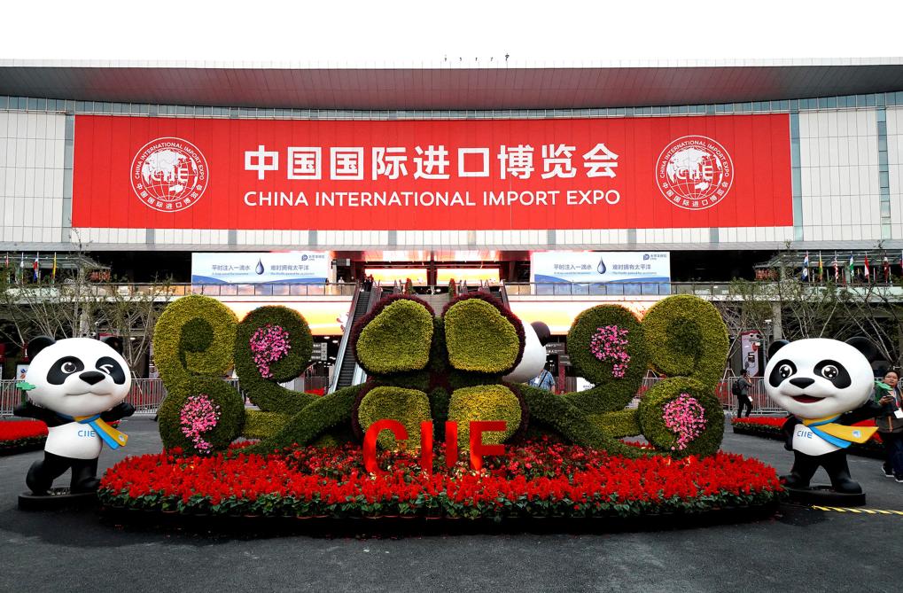 2018年11月4日,在國家會展中心(上海)場館外,進博會吉祥物“進寶”準備迎接四方賓客。新華社記者 陳飛 攝