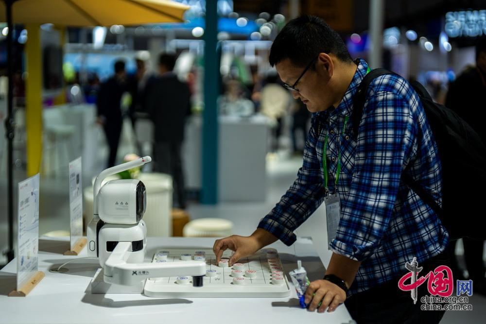 觀眾在智能裝備展示區(qū)圍觀新型外骨骼機(jī)器人。中國(guó)網(wǎng)記者
