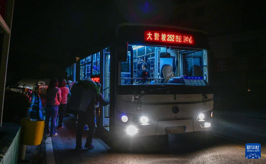 在貴陽(yáng)市烏當(dāng)區(qū)水田鎮(zhèn)定扒村,菜農(nóng)登上252路“惠農(nóng)專(zhuān)線”公交車(chē),準(zhǔn)備進(jìn)城賣(mài)菜(11月7日攝)。
