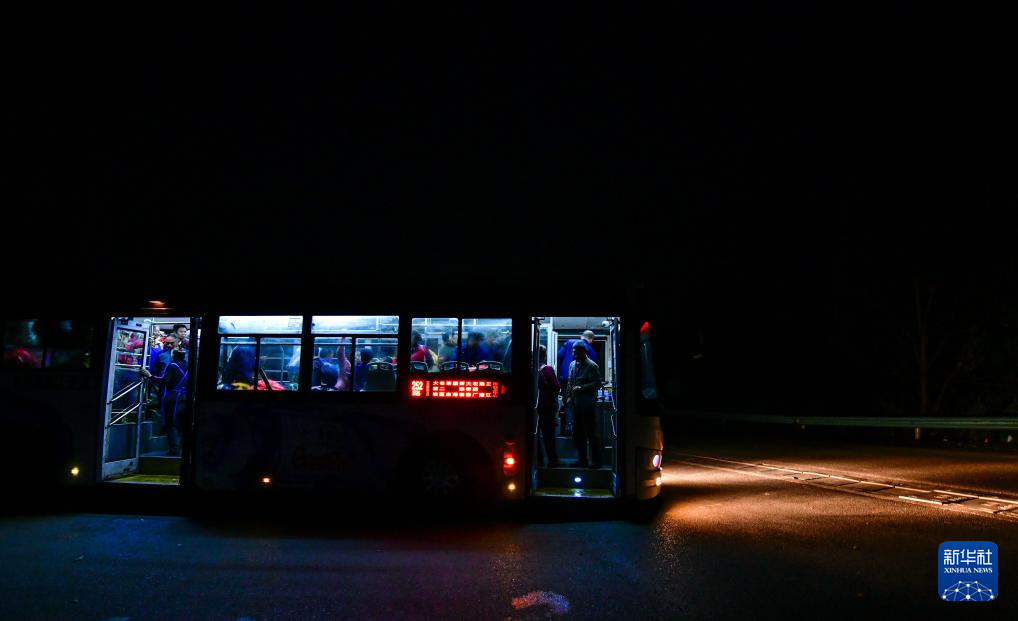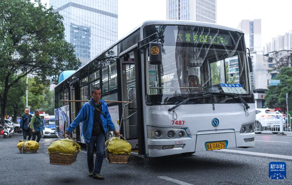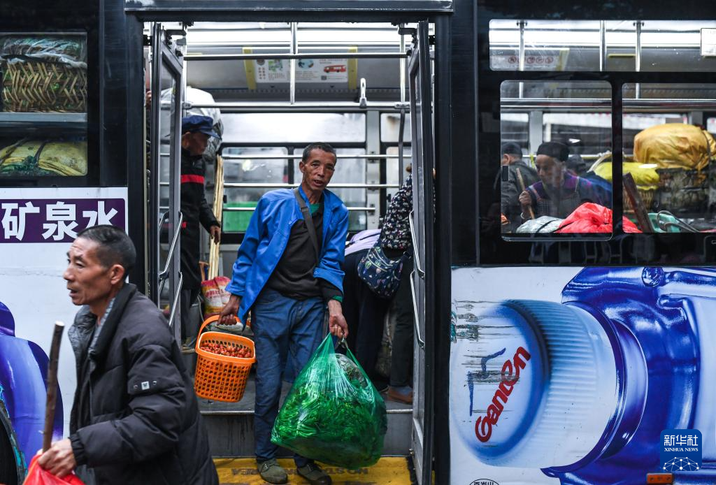 菜農(nóng)乘坐252路“惠農(nóng)專(zhuān)線”公交車(chē)抵達(dá)貴陽(yáng)市大營(yíng)坡終點(diǎn)站下車(chē)(11月7日攝)。