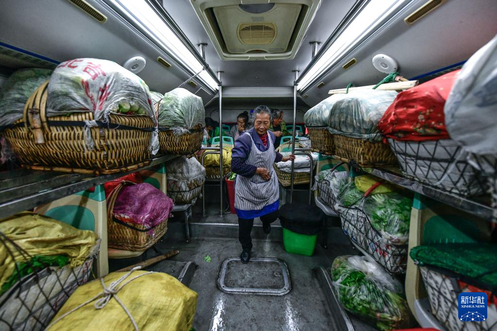 菜農(nóng)從貴陽(yáng)市烏當(dāng)區(qū)水田鎮(zhèn)定扒村乘坐252路“惠農(nóng)專(zhuān)線”公交車(chē)進(jìn)城賣(mài)菜(11月7日攝)。