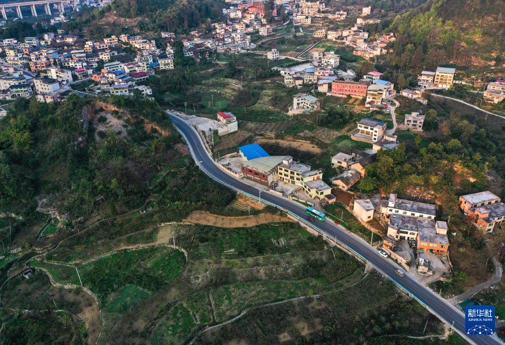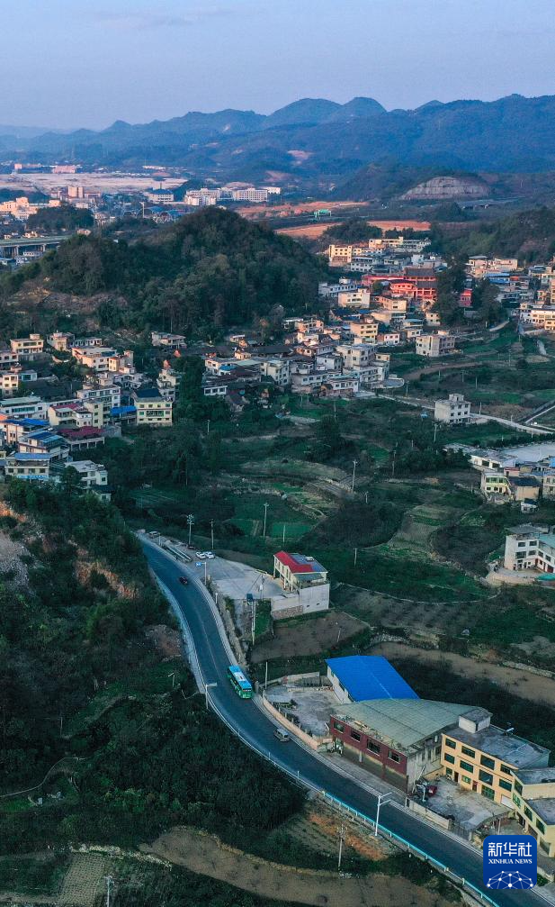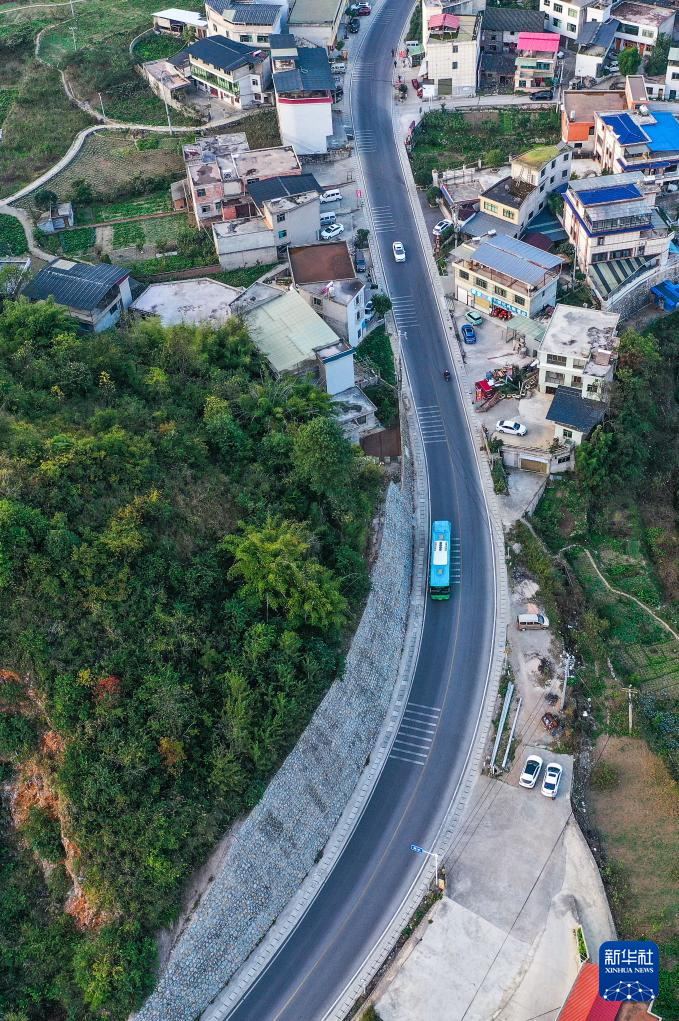 11月10日,252路公交車(chē)行駛在貴陽(yáng)市烏當(dāng)區(qū)水田鎮(zhèn)境內(nèi)(無(wú)人機(jī)照片)。
