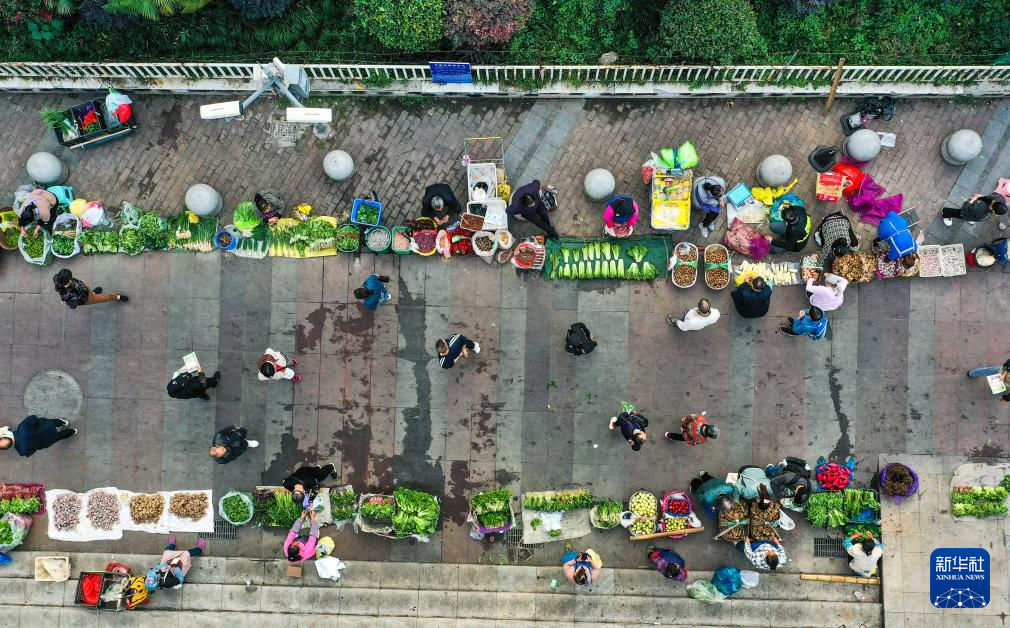 11月11日,市民在貴陽(yáng)市大營(yíng)坡附近選購(gòu)“惠農(nóng)專(zhuān)線”公交車(chē)運(yùn)送來(lái)的新鮮農(nóng)產(chǎn)品(無(wú)人機(jī)照片)。