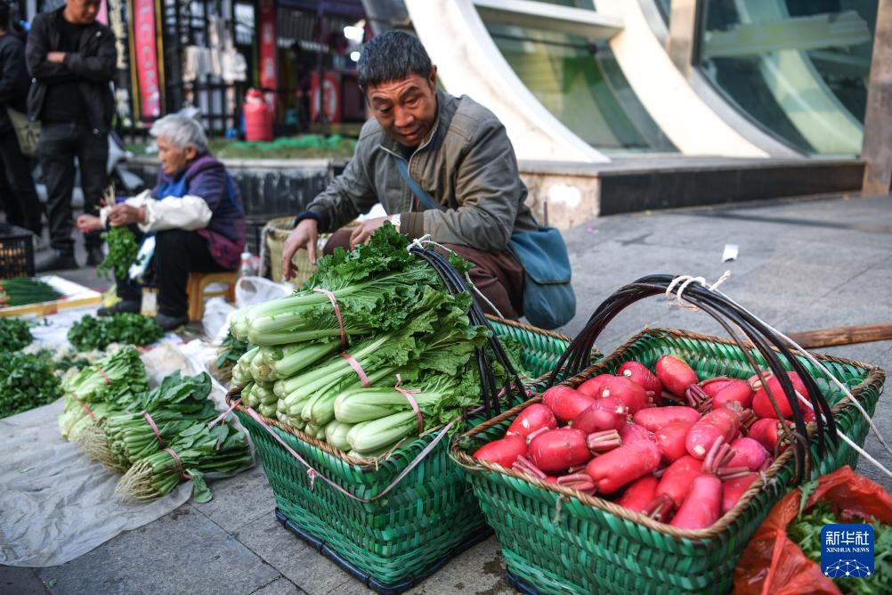 乘坐252路“惠農(nóng)專(zhuān)線”公交車(chē)進(jìn)城的菜農(nóng)在貴陽(yáng)市大營(yíng)坡附近賣(mài)菜(11月7日攝)。
