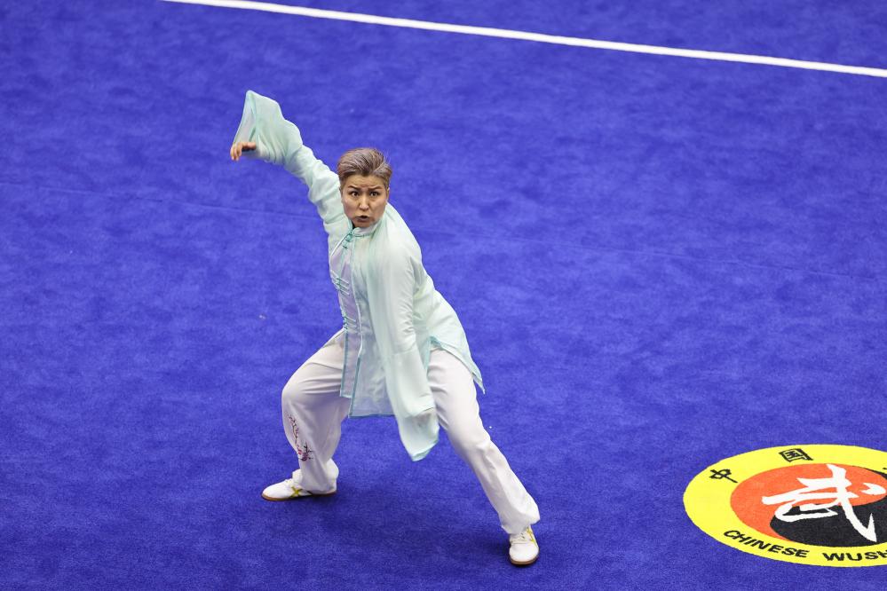 一襲素色的武術服,衣袖微微飄揚,維吾爾族女選手地里娜爾·地里夏提的步伐穩(wěn)健扎實,拳法充滿力量與自信。