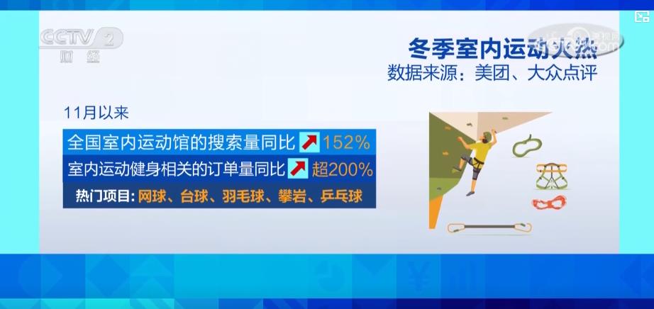 數(shù)據(jù)顯示,11月以來,全國室內(nèi)運動館的搜索量同比增長152%,與室內(nèi)運動健身相關(guān)的訂單量同比增長超200%,網(wǎng)球、臺球、羽毛球、攀巖、乒乓球是其中的熱門項目。